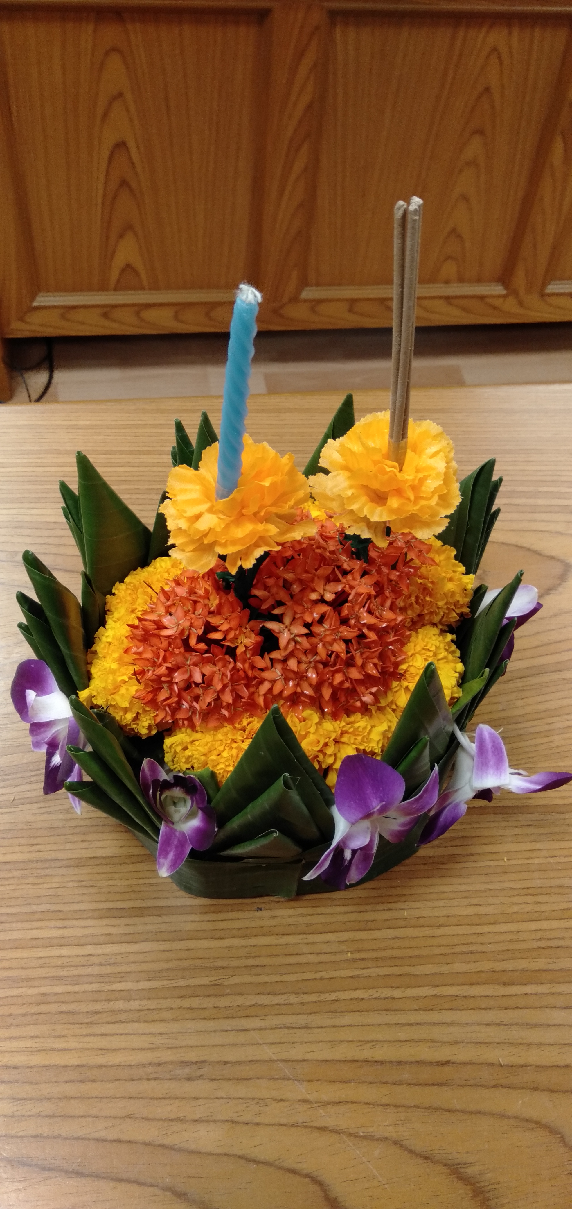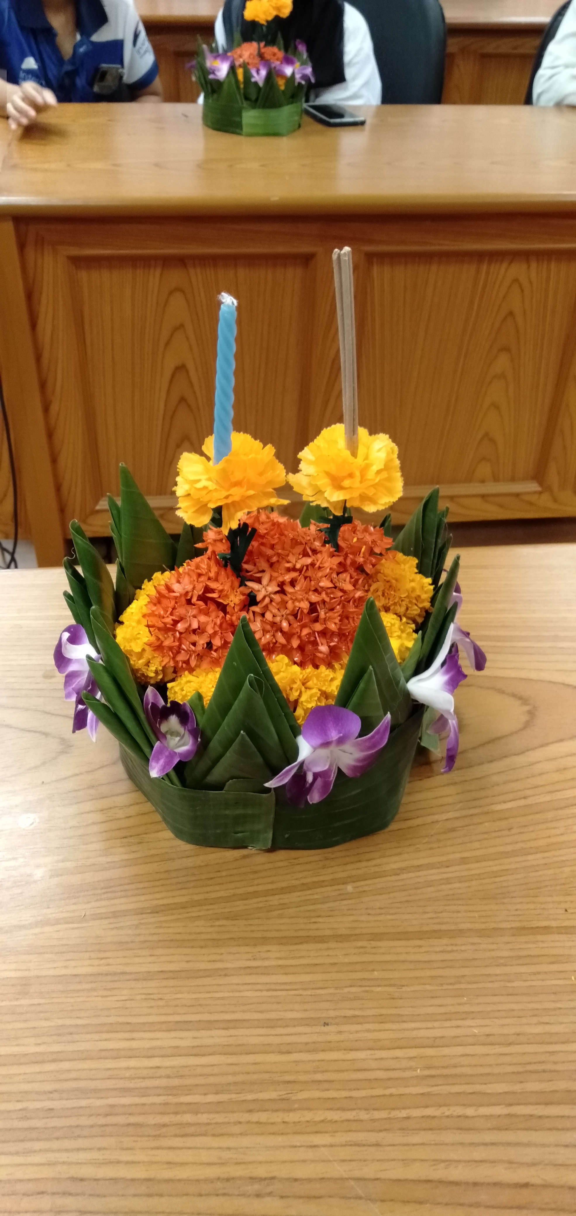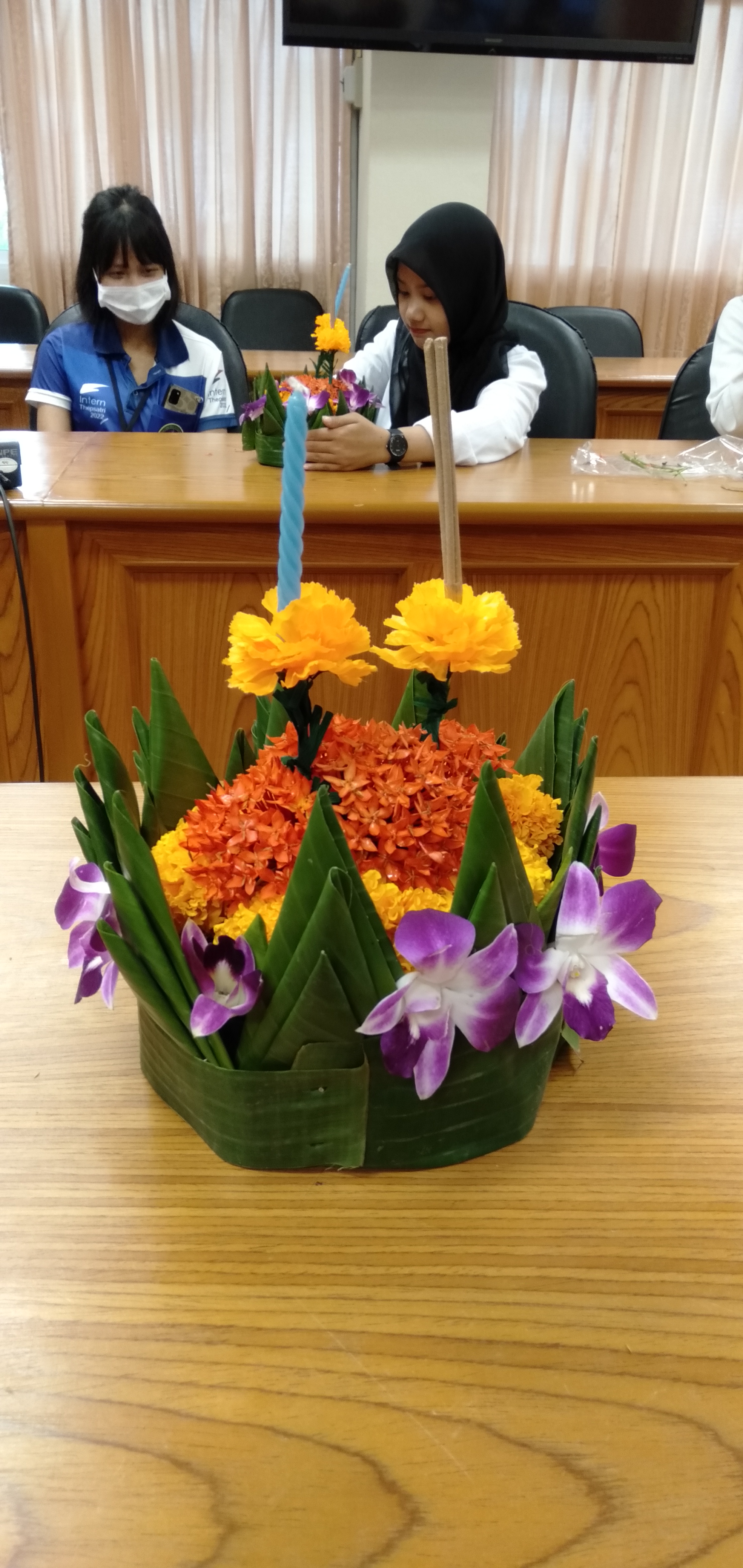 Our first day here, while we’re here, we were borrowed a room by Ajarn Abb, she was a general science teacher. Actually, she was my friend’s mentor. And in our first day, we’re making the loy krathong. It was like a floating things made from banana stem and we’re closed it with banana leaves and also we added some flowers and candles on it. And it could be floated on the water. This was my first time made the Loy Krathong. It’s a little bit hard but i fell so excited.