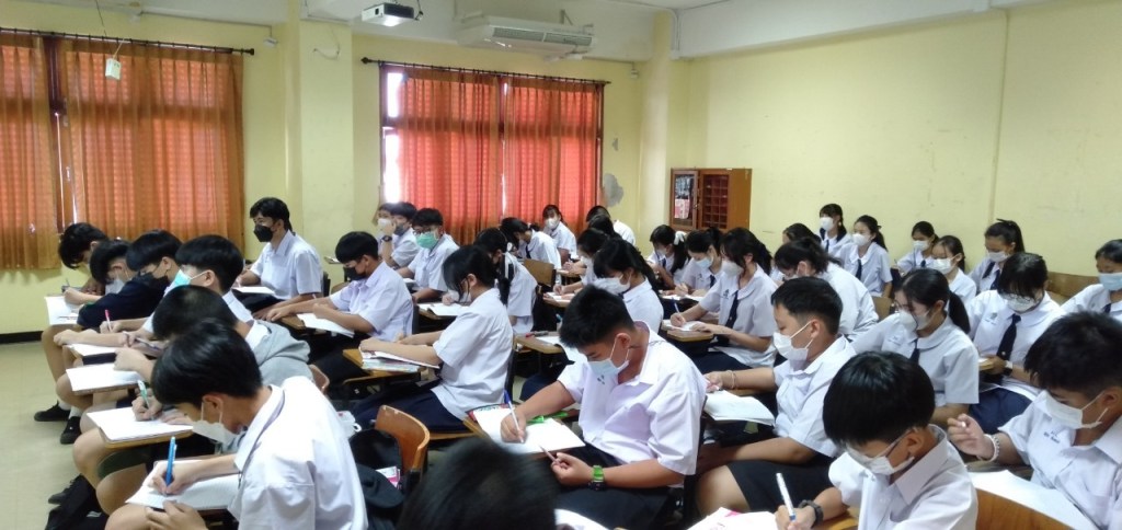 Today, we just passed our day with usual day like before. In the morning, we followed the ceremony. In the ceremony we stand behind the students just like the other ajarn. After ceremony, and pray, there were some news declared every morning. And after that, i followed Ajarn May’s class in Matthayom 4/1 2 learning hours from 08.30 – 10.10. Then the next hour i also followed ajarn May in Matthayom 4/2 till lunch break.