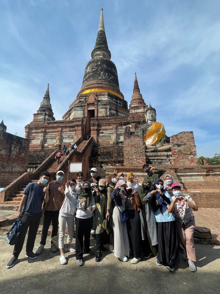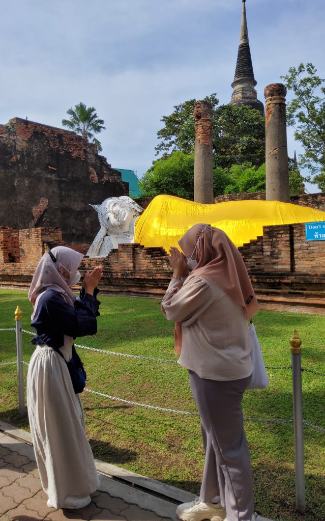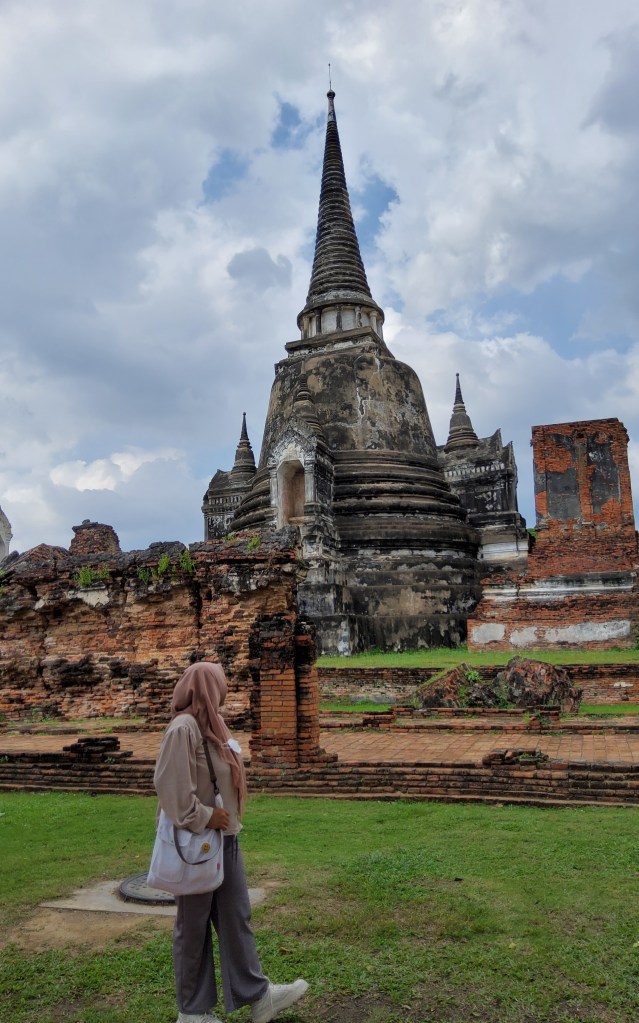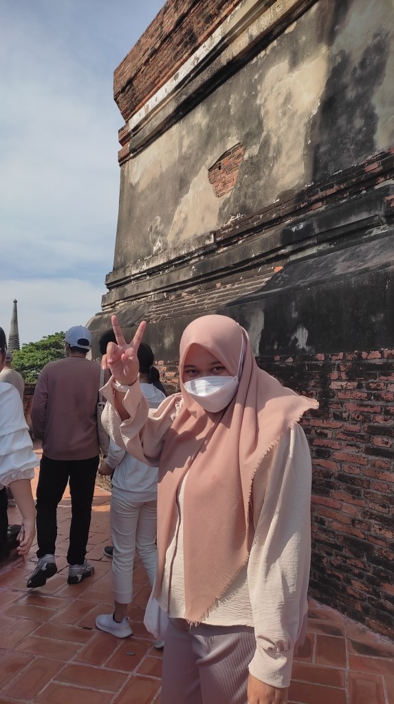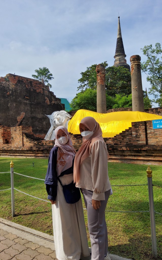 Today, we got another trip again. Last week we went to the National Science Museum and Dream World in Bangkok. But today, we went to Ayutthaya. Initially, the van will picked us up at 7.30 a.m from the dormitory. Of course this was so exciting. In the morning, Atom and me started to prepare ourselves. I tried to pick a khaki shirt with grey trousers and a beige hijab. I did some make up on my face and voila, i was ready to go.