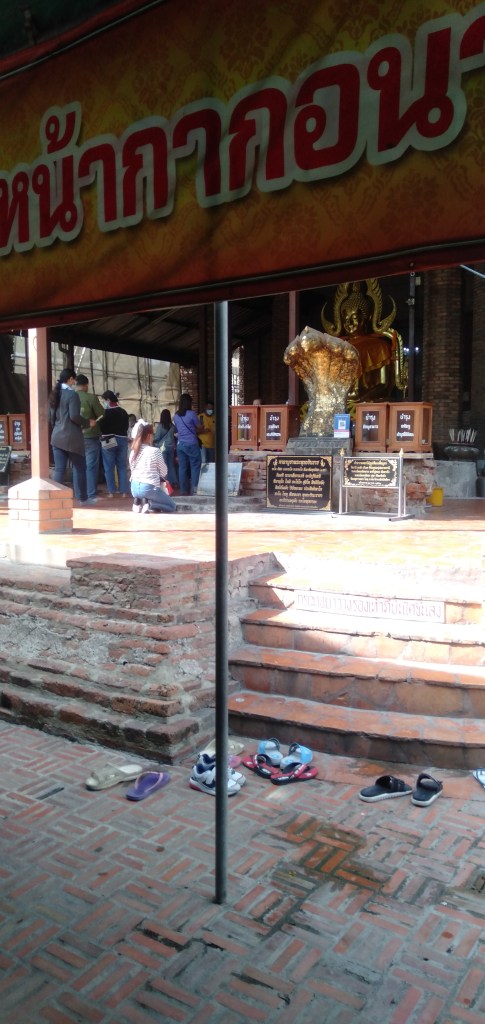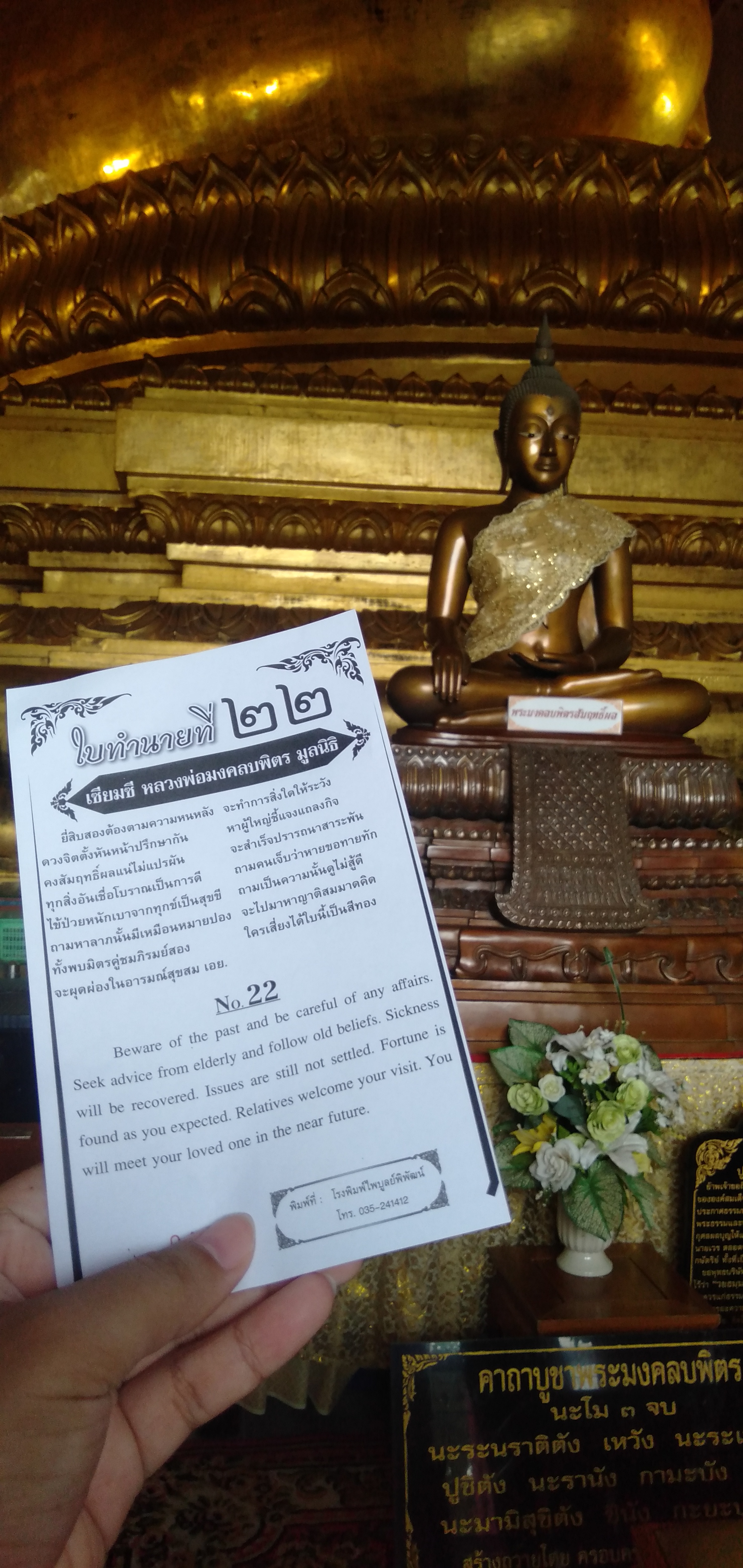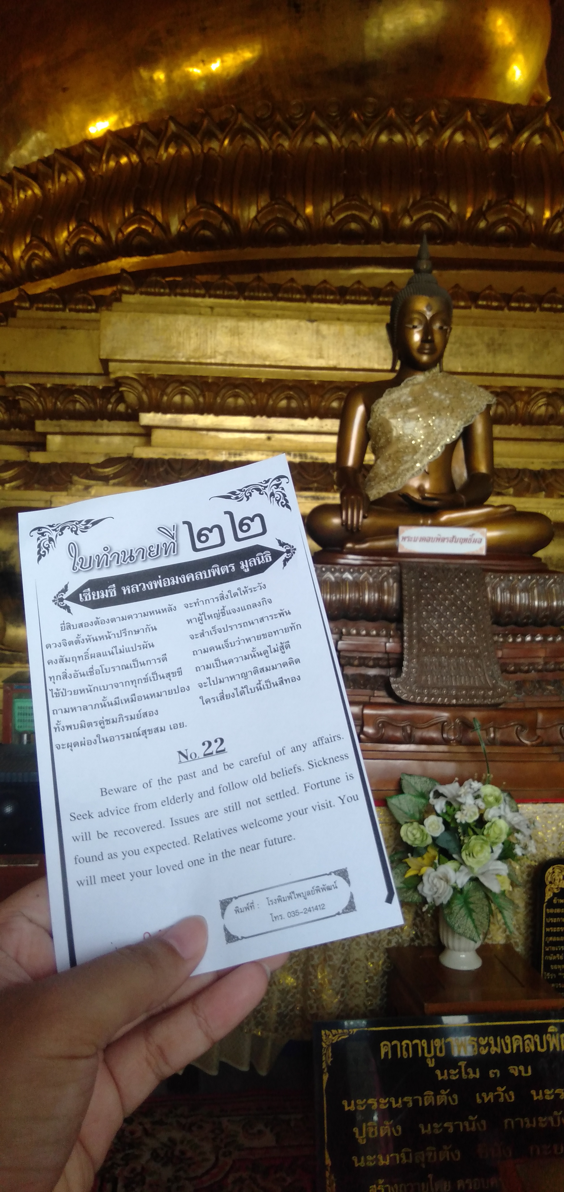 Here we just needed to grab our pocket 100 baht. And for me, it was worth it. After that we continue our walk try to surround the temple and took photos when we got a good spot. And then, the road ended on the beautiful vihara with a huge buddha was sit in it. We must take off our shoes before we entered to respect the buddha. The buddha was so huge and so shiny and it was made from gold i guess. Here there was so many pictures from the buddha itself and so many histories inside the building. Then after a long walk, i saw my friends shooke a glass with sticks in it. I just got curious and tried it too. I shooke it till one stick come out and it would say what would happen in the future, like a phychic. And then i tried to read it, and it said like this “Beware of the past and be careful of any affairs. Seek advice from elderly and follow old beliefs. Sickness will be recovered. Issues are still not settled. Fortune is found as you expected. Relatives welcome your visit. You will meet your loved one in the near future”. I asked P’Mon to explain me what happened. And she said mine was so so. It’s balance :3