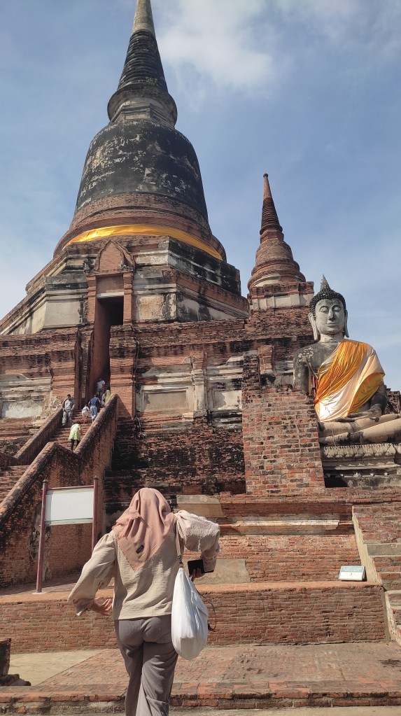 After we had lunch and prayed dhuhur, we went to the temple. I didn’t know exactly how we called this. But something exactly what i know was, it was a temple like borobudur in Indonesia, or Prambanan temple. Its landscape was so beautiful, and there was a huge- no massive temple i don’t know should i call it temple or vihara because there was a lot of people who come here to pray and enjoy the view. On the first walk, we saw a huge temple maybe that was the main temple, and we needed to use the stairs. So many stairs haha till we arrived on the top.